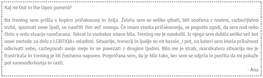 Veliko smo se tudi pogovarjale_i in razmiÅ¡ljale_i o naÅ¡ih vlogah v skupini, delovanju skupine, naÅ¡em doživljanju in Äustvih. Pogovarjale_i smo se o naÅ¡ih vrednotah in prepriÄanjih, ki jih je v nas položila družba. Poglobile_i smo se tudi v LGBTIQA+ temo, spoznale_i nekaj teoretiÄnih konceptov, ki nam bodo priÅ¡li Å¡e kako prav pri naÅ¡em delu.
