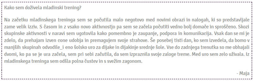 Delile_i smo sebe, svoje izkuÅ¡nje, Äustva in doživljanje. SreÄale_i smo se z visokimi cilji, ki smo jih skupaj uspeÅ¡no preplezale_i, preskoÄile_i in prehodile_i. Iskale_i smo inovativne reÅ¡itve in se pri tem uÄile_i o svojih mejah. Pogosto smo izstopile_i iz naÅ¡ih con udobja in naredile_i prostor za nove izkuÅ¡nje in znanja.