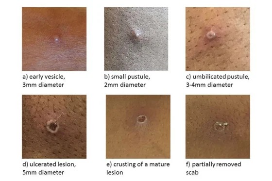NIJZ piÅ¡e: “Klinični potek opičjih koz je običajno blag. Simptomi bolezni so zviÅ¡ana telesna temperatura, glavobol, bolečine v miÅ¡icah, otekle bezgavke, mrzlica in izčrpanost. Običajno se razvije tudi izpuščaj. Ta se pogosto začne na obrazu, nato pa se razÅ¡iri na druge dele telesa, vključno z genitalijami. Pri nedavno odkritih potrjenih primerih, poročajo o pojavu izpuščajev na področju genitalij. Izpuščaj gre skozi različne faze in je podoben noricam ali sifilisu, preden se končno oblikuje krasta, ki kasneje odpade. Inkubacijska doba bolezni je običajno 6 do 16 dni, lahko pa tudi do 21 dni. Ko krasta odpade, oseba ni več kužna.