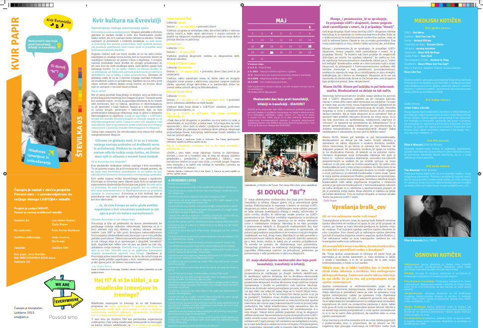 V sklopu naÅ¡ega projekta Povsod smo – s prostovoljstvom do veÄjega dosega mladih, oziroma na kratko: Povsod smo, bomo organizirale_i informativne stojnice po Sloveniji, izdaljale_i priÄujoÄi Äasopis Kvir papir, podcast All for Rainbow, ki ga lahko spremljaÅ¡ na naÅ¡em Youtube kanalu ter aktivnosti za starÅ¡e LGBT+ oseb.