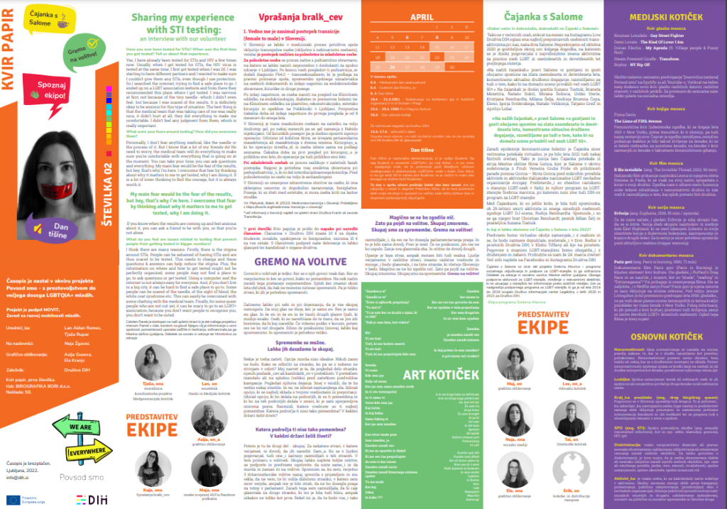 V sklopu naÅ¡ega projekta Povsod smo – s prostovoljstvom do veÄjega dosega mladih, oziroma na kratko: Povsod smo, bomo organizirale_i informativne stojnice po Sloveniji, izdaljale_i priÄujoÄi Äasopis Kvir papir, podcast All for Rainbow, ki ga lahko spremljaÅ¡ na naÅ¡em Youtube kanalu ter aktivnosti za starÅ¡e LGBT+ oseb.
