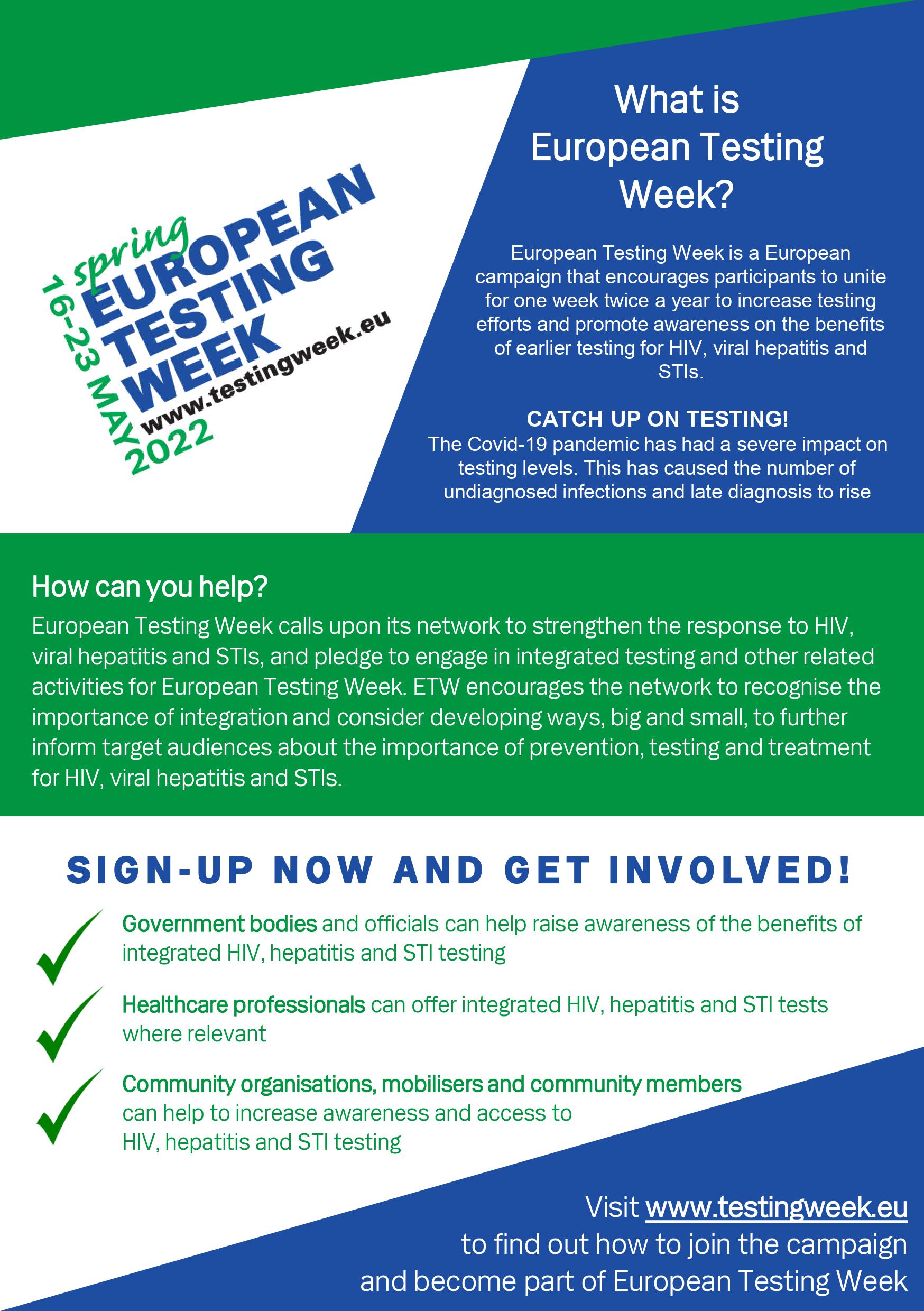Evropski teden testiranja je bil oblikovan s strani iniciative EuroTEST (naslednica HIV in Europe) leta 2013 s ciljem spodbujati testiranje na spolno prenosljive okužbe in promovirati ozaveÅ¡Äenost o argumentih za testiranje. Dvakrat letno ponuja priložnost razliÄnim partnerjev, da se združijo v kampanjah, s katerimi informirajo ljudi o tveganjih SPO, zdravljenju in prisotni stigmi. Trenutno ga podpira 45 mednarodnih na nacionalnih organizacij, vkljuÄno z UNAIDS, European AIDS Clinical Society, AIDS Action Europe in druge.
