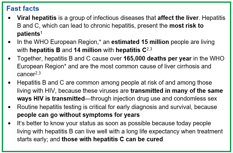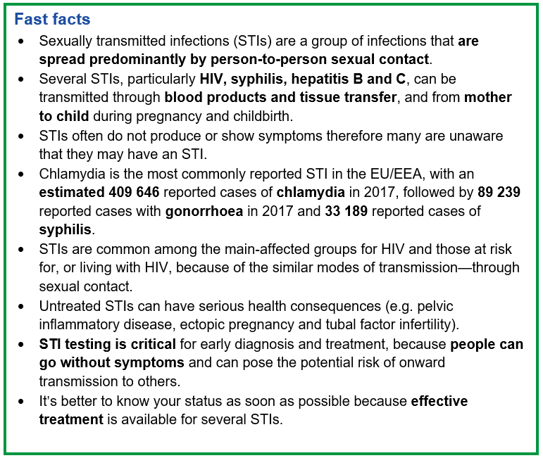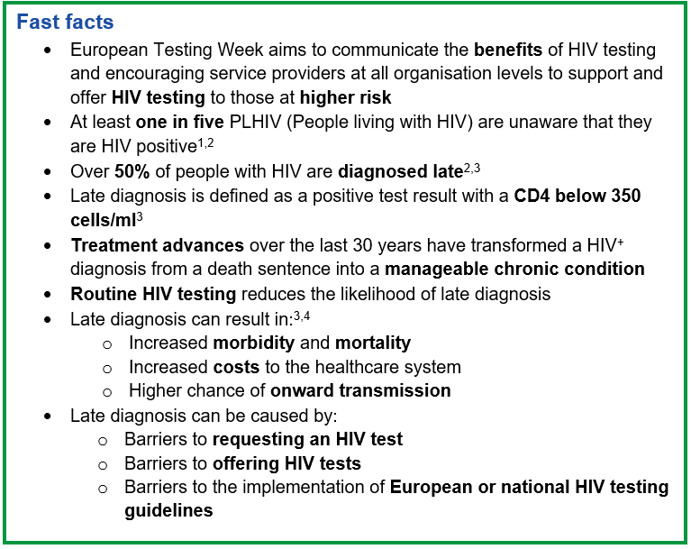 Po podatkih organizatorjev je med osebami, ki živijo s HIVom v Evropi, veÄ kot 2 milijona takÅ¡nih, ki tega, da so okužene, sploh ne vedo. VeÄ kot polovica diagnosticiranj z virusom HIV je poznih, kar pomeni, da je poznejÅ¡i tudi dostop do zdravljenja. V Evropi živi približno 15 milijonov ljudi, ki so pozitivni na Hepatitis B in C, ogromen delež pa jih ostane nediagnosticiran. Ena izmed težav pri marsikateri spolno prenosljivi okužbi je dejstvo, da simptomi (dolgo) niso vidni; mnogo ljudi o svoji okuženosti sploh nima informacije. Raziskave kažejo, da so trendi okužb s klamidijo trenutno stabilizirani, raste pa Å¡tevilo okužb z gonorejo in sifilisom. Narediti moramo torej veÄ, da zagotovimo ustrezen dostop do testiranja.